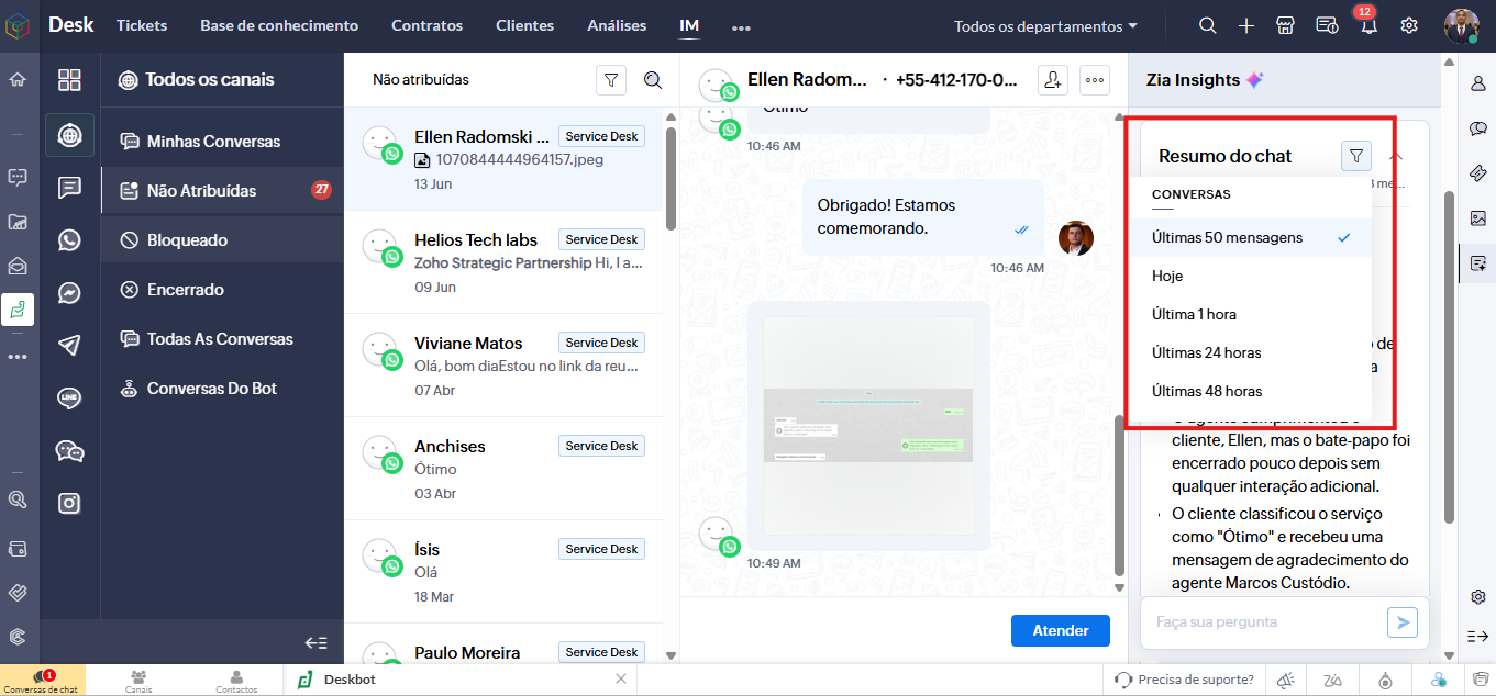 Tempo de resposta mais rápido: As sugestões de respostas e o resumo da conversa permitem acessar informações rapidamente e gerar respostas adequadas sem precisar ler longas conversas.