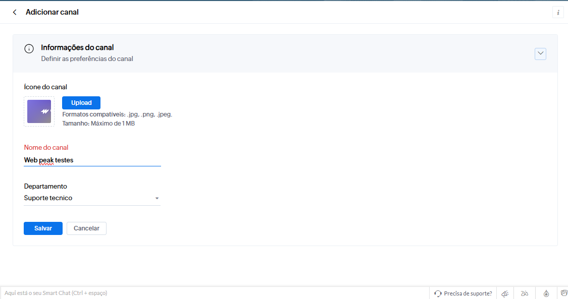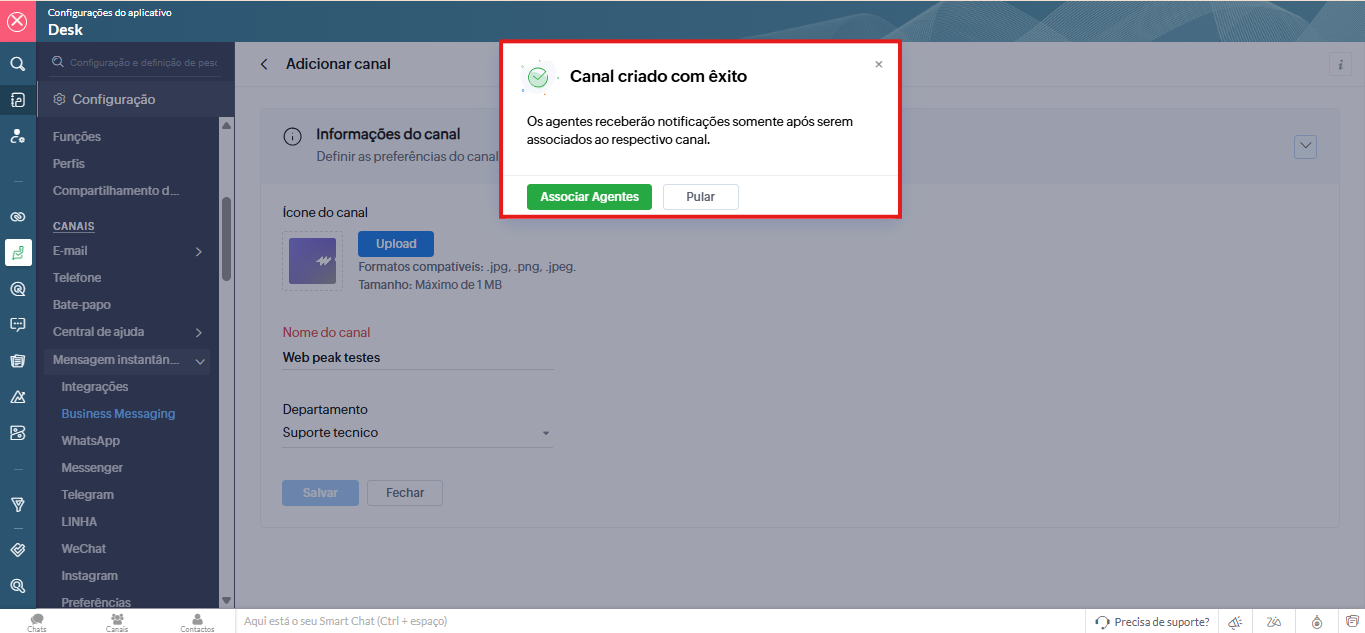 Informação: O número de canais criados não pode exceder o número de departamentos ativos na sua conta.