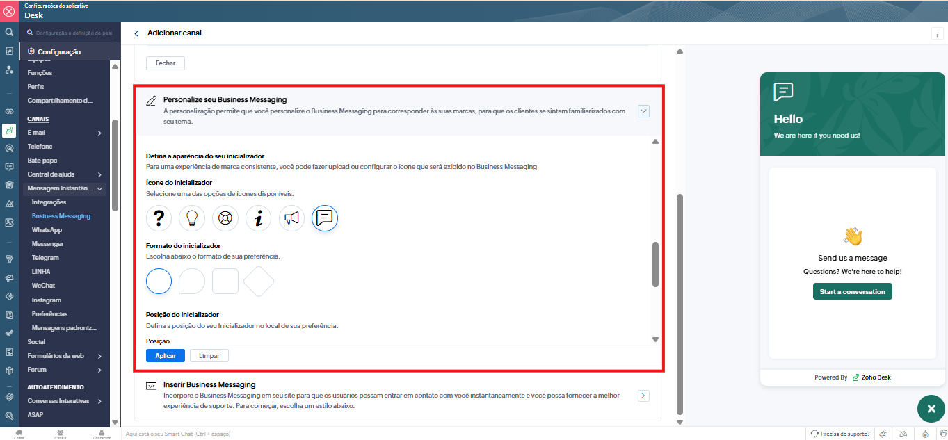 Configuração → Canais → Mensagens Instantâneas → Mensagens Comerciais → Configurar → Canal → Personalizar a aparência do iniciador de mensagens comerciais.