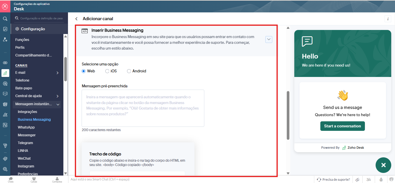 Para configurar o balão de mensagem incorporável, você precisará dos detalhes do widget de Mensagens Comerciais vinculado. Com esses dados, será gerado um trecho de código exclusivo para sua conta.