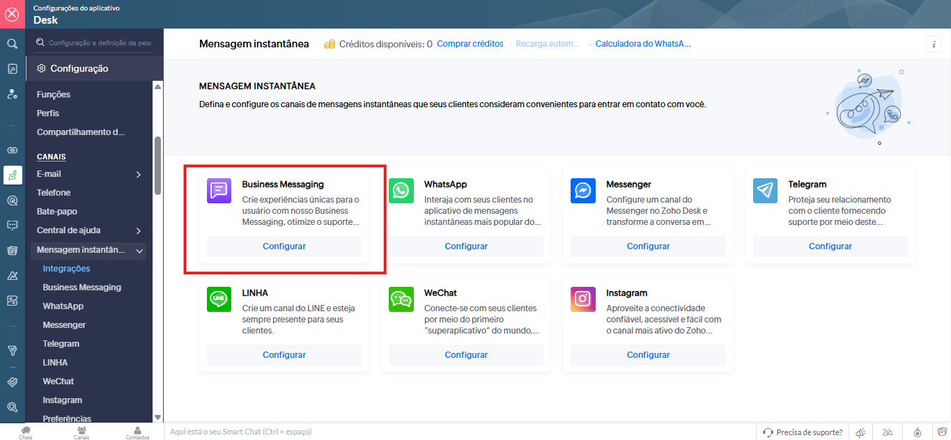 Clique em Configurar, correspondente a Mensagens Comerciais, na página de Mensagens Instantâneas.