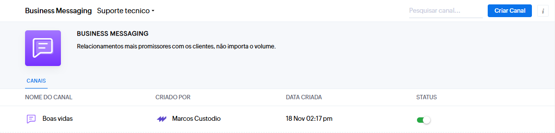 Clique em Criar Canal na página de integração de Mensagens Comerciais.