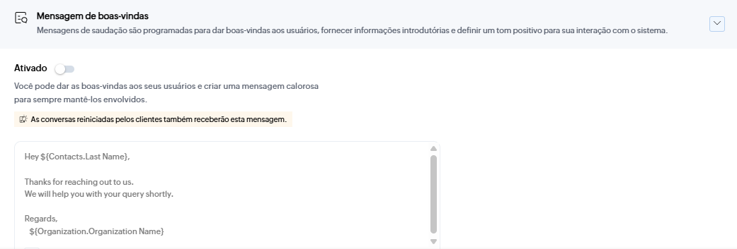 Use a barra de alternância para ativar a opção Ativar mensagem de boas-vindas.