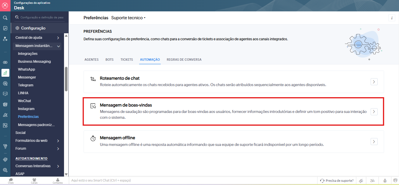 ImportanteAs mensagens de boas-vindas são configuradas por departamento, e cada canal de mensagem é associado a um departamento.