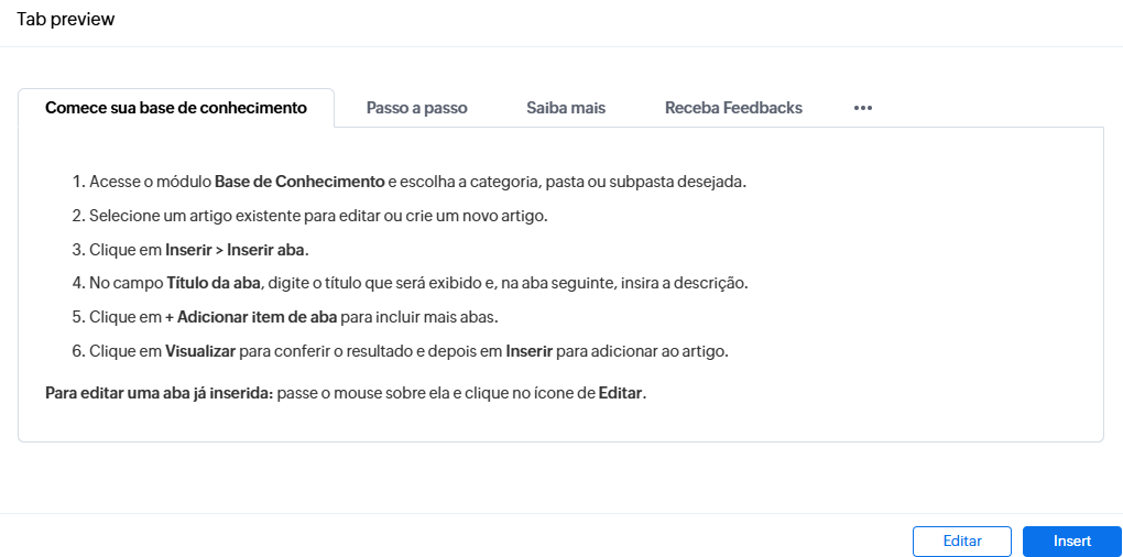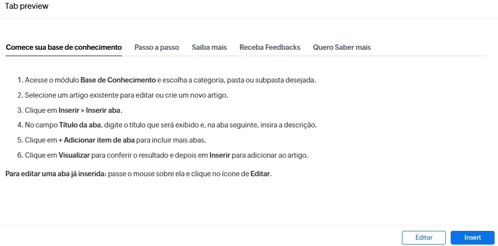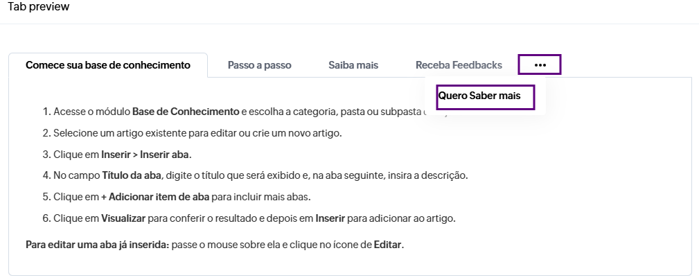 O conteúdo do artigo pode ser organizado em abas, permitindo separar diferentes tópicos de forma estruturada. Cada aba possui um título fixo, e os leitores podem clicar nela para acessar o conteúdo correspondente. Existem dois tipos de visualização por abas disponíveis.