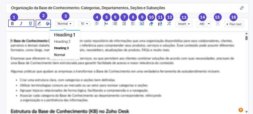 O Zoho Desk conta com um editor de conteúdo integrado no formato WYSIWYG ("What You See Is What You Get"), que facilita a criação e edição de artigos da base de conhecimento de acordo com o estilo desejado. Com uma interface intuitiva, ele oferece desde recursos básicos até opções avançadas de formatação, além da possibilidade de editar em HTML, garantindo aos autores maior controle sobre o visual e a estrutura do conteúdo.