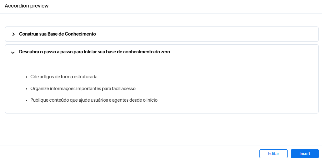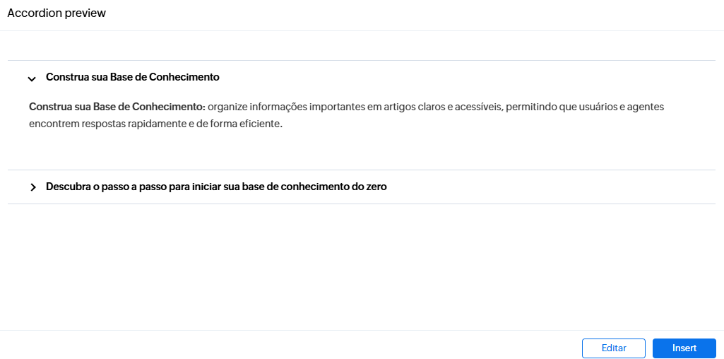 Para editar um acordeão já inserido: passe o mouse sobre ele e clique no ícone de Editar.