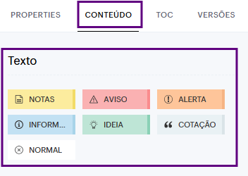 No editor da Base de Conhecimento, os estilos de texto disponíveis são: Nota, Aviso, Alerta, Informação, Ideia, Cotação e Normal.