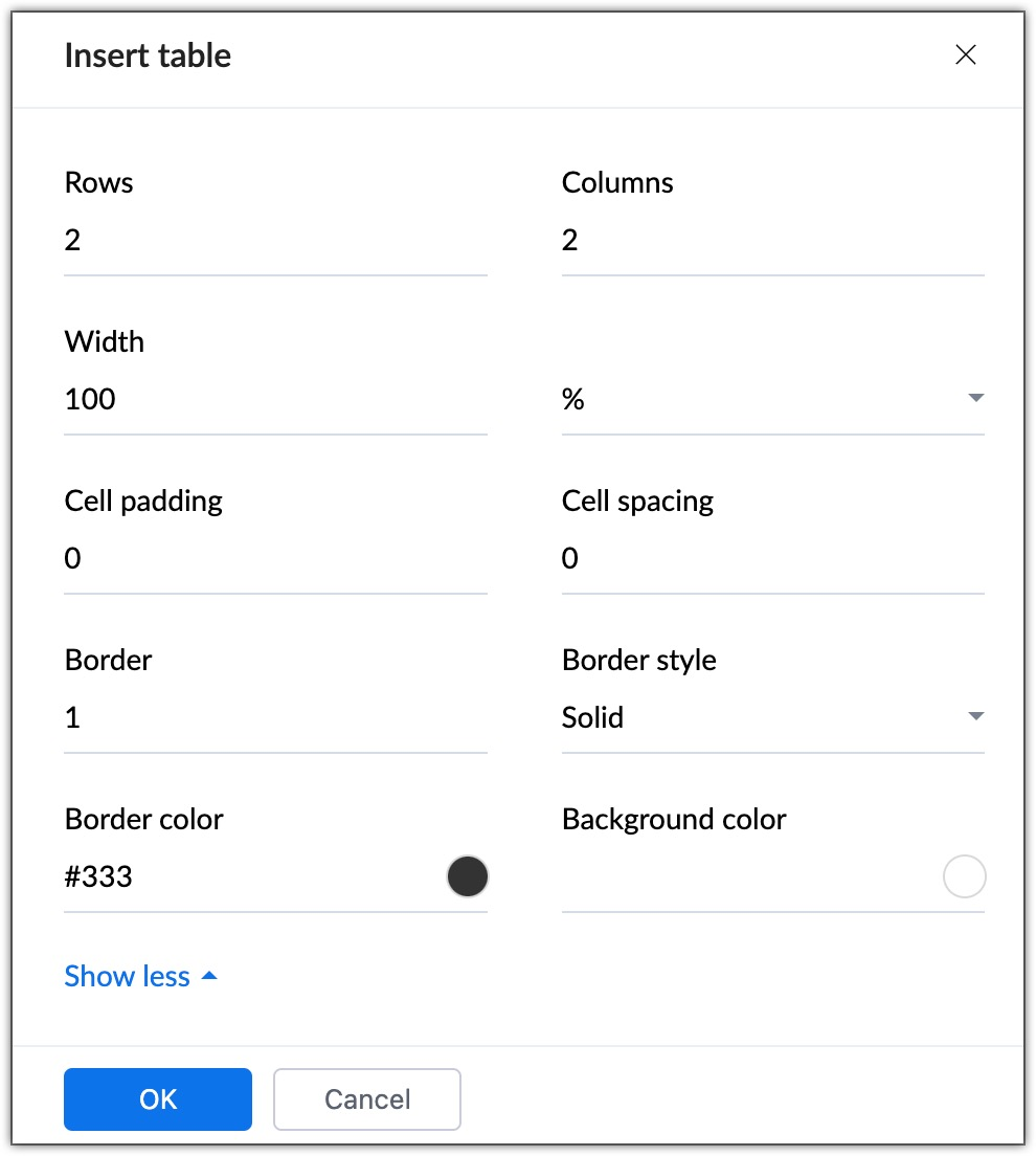 Os usuários podem definir o número de linhas e colunas da tabela e personalizar seu estilo e cores. Outras funcionalidades adicionais estão listadas abaixo e também podem ser acessadas clicando com o botão direito do mouse sobre a tabela.
