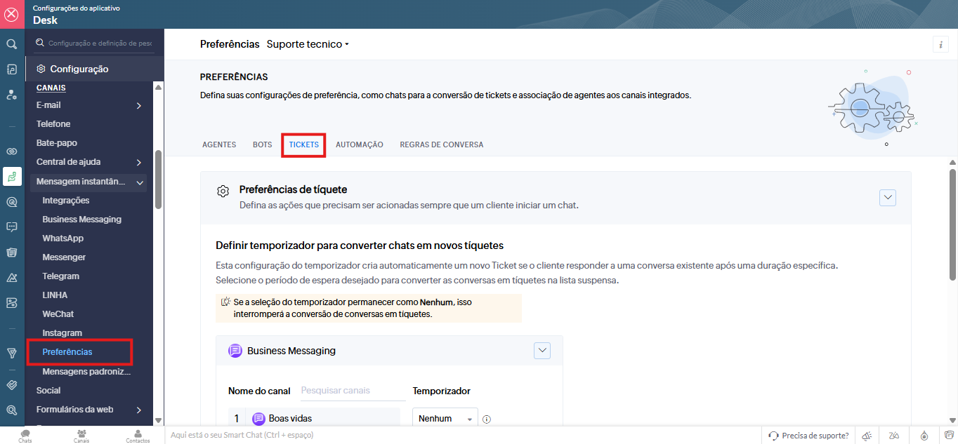 WhatsApp | Janela de 24 horas para respostas comerciais. | Se o temporizador estiver configurado para mais de 24 horas, o chat poderá ser encerrado antes que o sistema consiga criar um ticket. | Os agentes devem iniciar uma nova mensagem através de um modelo do WhatsApp. |