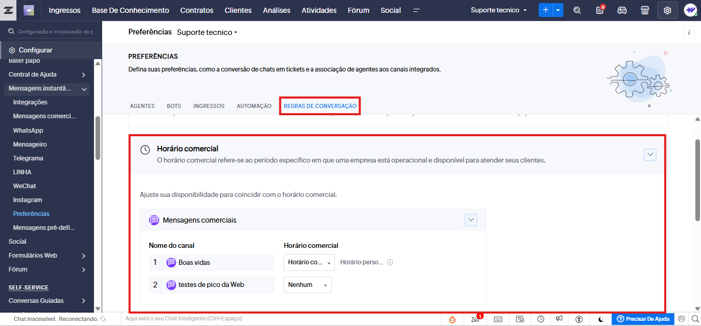 Antes de configurar os canais de SLA ou de mensagens instantâneas, você precisa primeiro criar um horário comercial em: Configuração > Organização > Horário comercial. Saiba como criar um horário comercial.