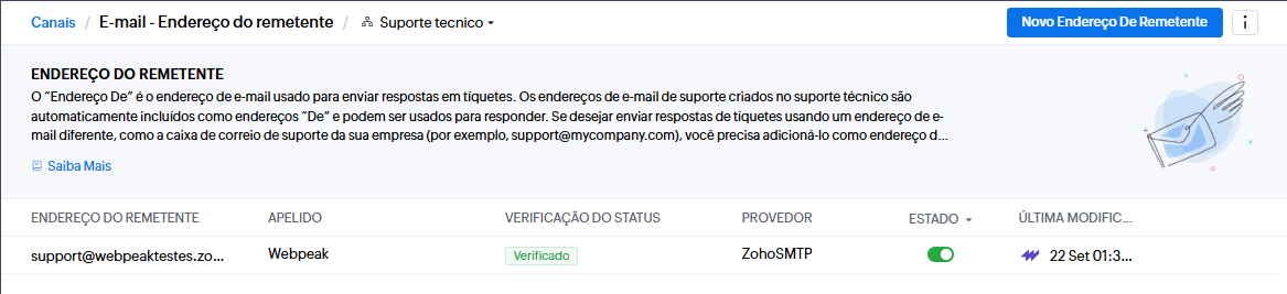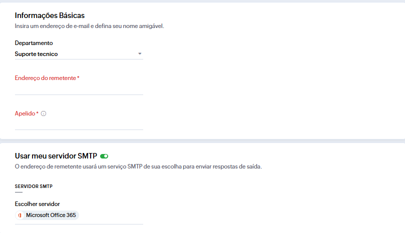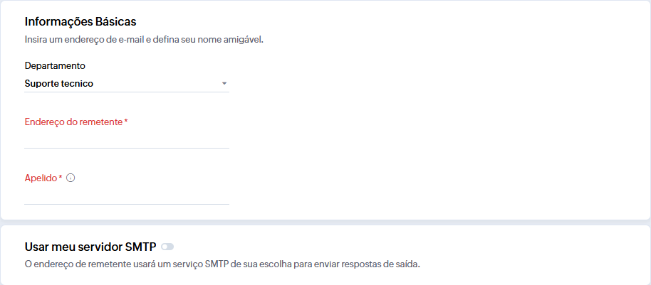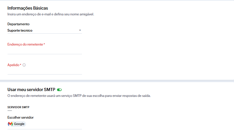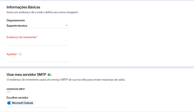 Notas:Os e-mails enviados a partir do endereço de remetente personalizado podem ser enviados usando um servidor SMTP para maior controle sobre a entrega. Adicione o endereço de remetente usando os detalhes do seu servidor SMTP no Zoho Desk.