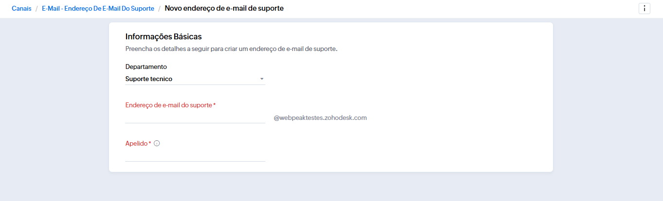 | Endereço de e-mail de suporte | Alias equivalente no Zoho Desk |
