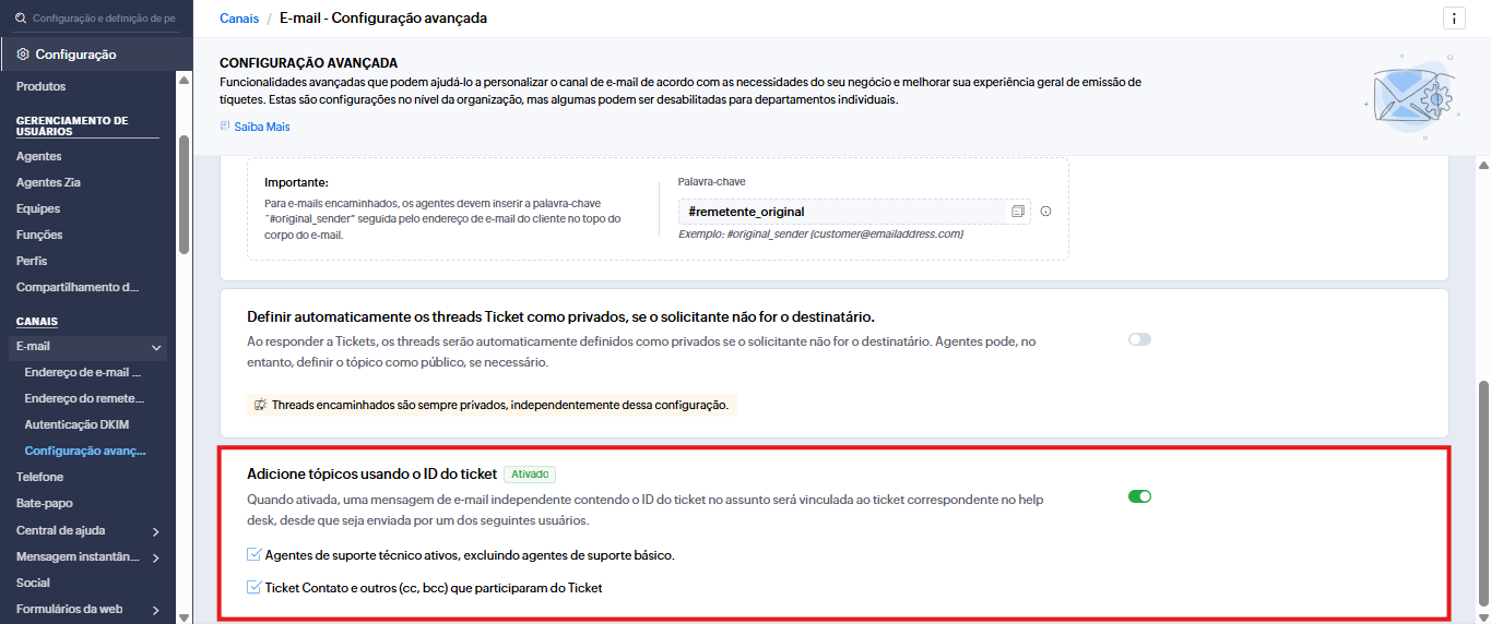 Para vincular as respostas de e-mail aos tickets usando o “ID do ticket”, habilite a opção Adicionar tópicos usando o ID do ticket. Se o assunto de um e-mail recebido incluir um ID de ticket existente, o sistema vinculará automaticamente a resposta ao ticket correspondente. Isso garante que a resposta seja corretamente agrupada em tópicos, evitando a criação de tickets duplicados para a mesma conversa.