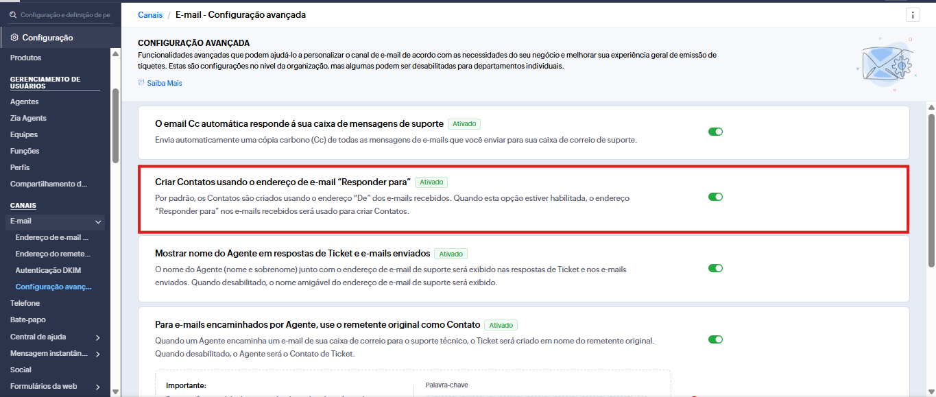 A seguir, você pode ver algumas opções de configuração que podem ser úteis para determinar como gerenciar seu canal de e-mail.