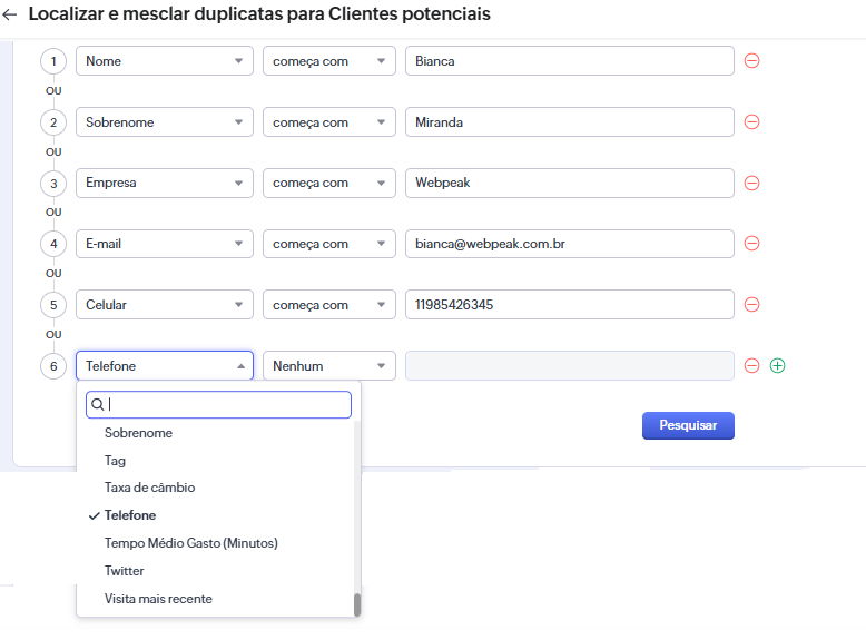 Além disso, essa ferramenta permite definir critérios adicionais para a busca de duplicados. Em cada módulo, é possível configurar até seis campos como parâmetros de pesquisa. Após identificar os registros duplicados, você poderá mesclá-los manualmente.