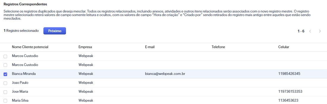 Na seção Registros Correspondentes, selecione pelo menos dois registros que deseja mesclar.