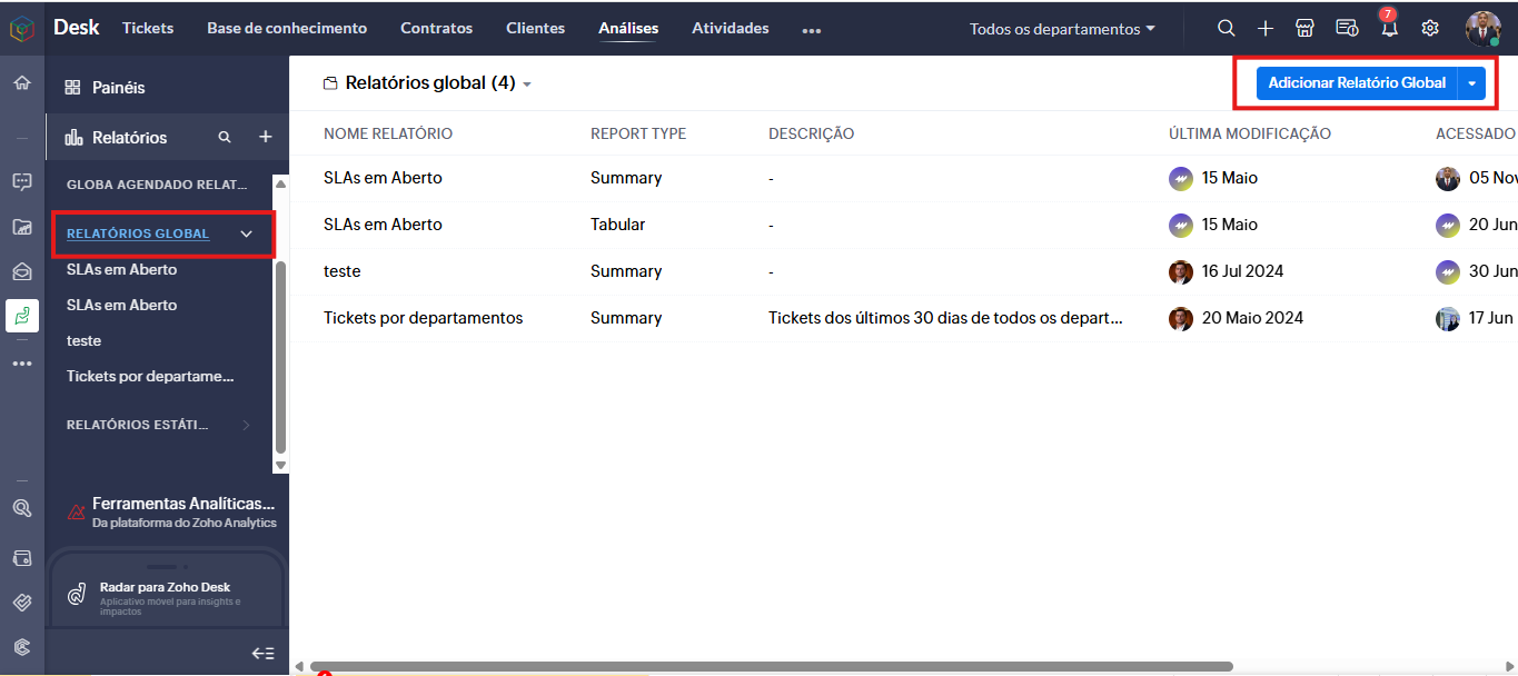 Os relatórios globais estão disponíveis somente para contas Professional e Enterprise no Zoho Desk.