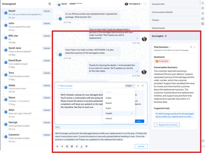 A tradução integrada ao Composer, com tecnologia Zia, suporta 15 idiomas, permitindo que os agentes se comuniquem de forma eficaz com clientes ao redor do mundo.